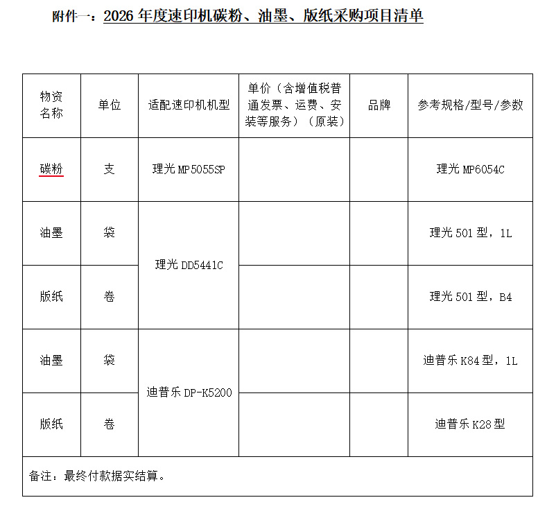 根据工作计划,现对2026年度文印室速印机碳粉、油墨、版纸耗材采购项目公开询价,欢迎有资质的供应商积极参与。